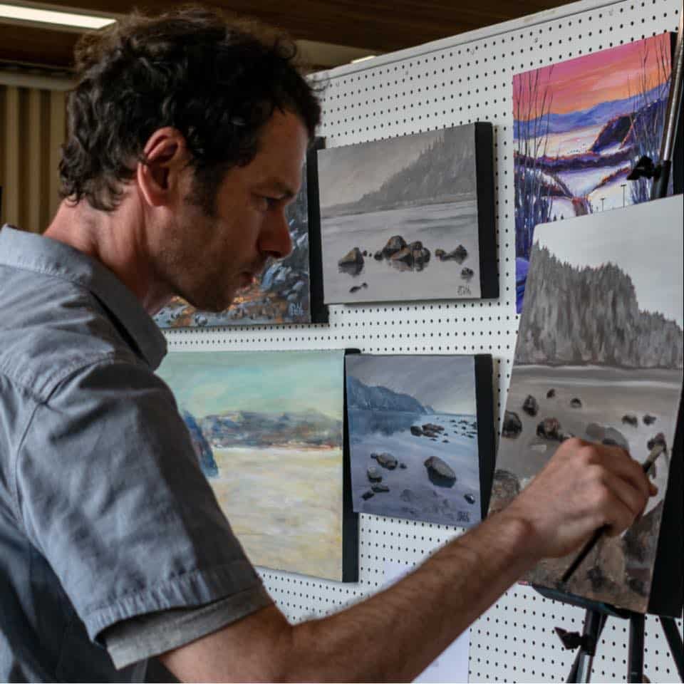 Jean est un peintre du Saguenay dont l’univers s’enracine profondément dans la nature boréale. À travers des peintures à l’huile riches en textures, en lumière et en profondeur, il capture la majesté des paysages nordiques : forêts dans les montagnes, ciels colorés ou brumeux, rocher typique et fjord majestueux où la lumière prend une dimension presque épique. Sa pratique de la peinture en plein air est essentielle : c’est dehors, au contact direct du territoire, qu’il trouve la vérité des couleurs, des ombres et des atmosphères.